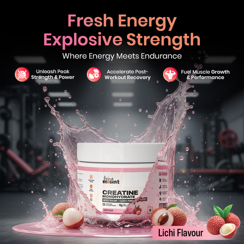 Experience sweet, juicy gains with Litchi-flavored BeingMount Creatine Monohydrate! Crafted to deliver strength, stamina, and faster recovery, this clean and 100% effective formula makes your workouts tasty and performance-driven.